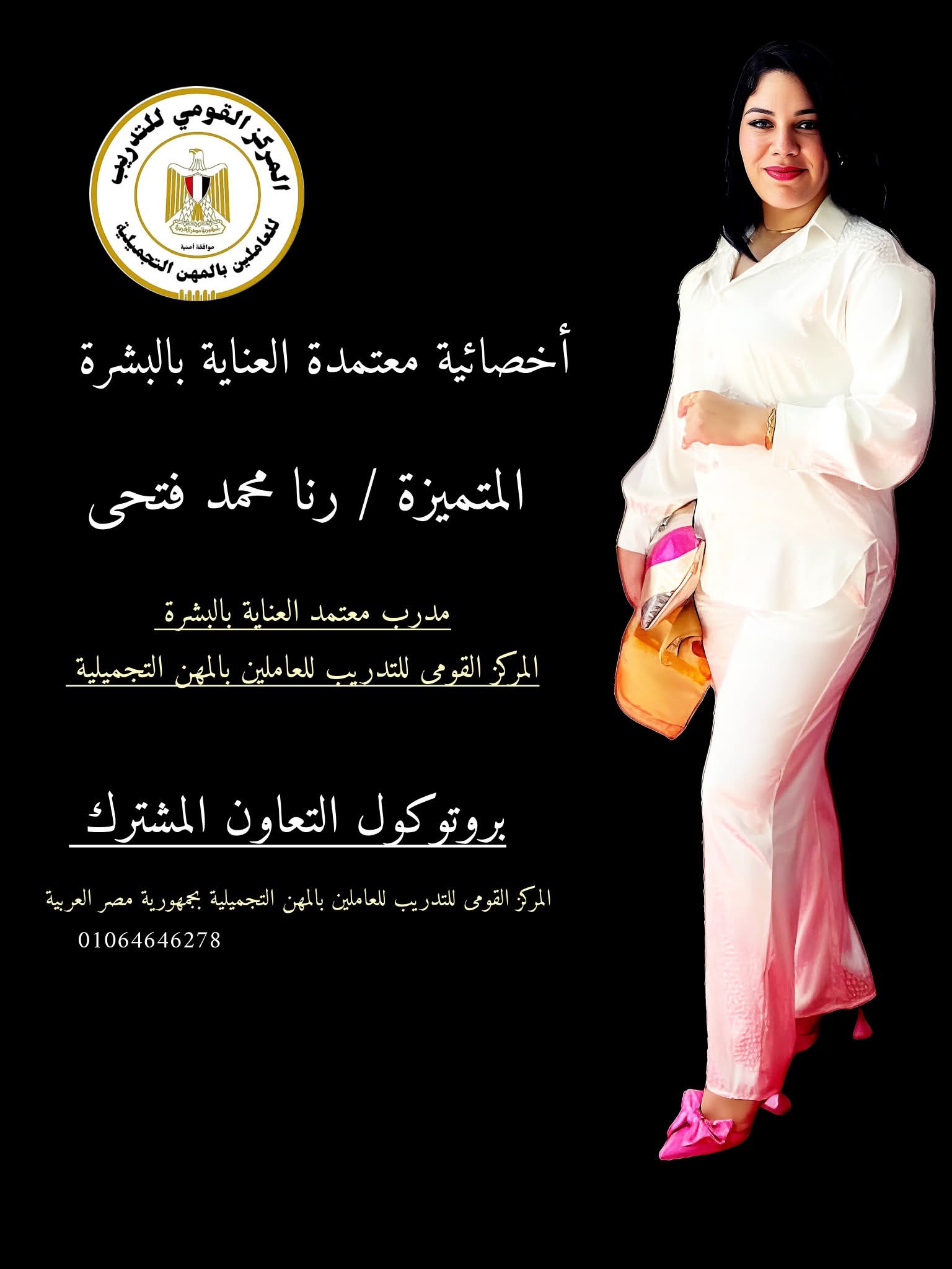 🟥 حصلت رنا محمد فتحي: على اعتمادها كمدربة معتمدة من المركز القومي للتدريب للعاملين بالمهن التجميلية بجمهورية مصر العربية. هذا المركز يحمل قيمة كبيرة، حيث إنه معتمد حكوميًا ويتمتع بمصداقية عالية.
